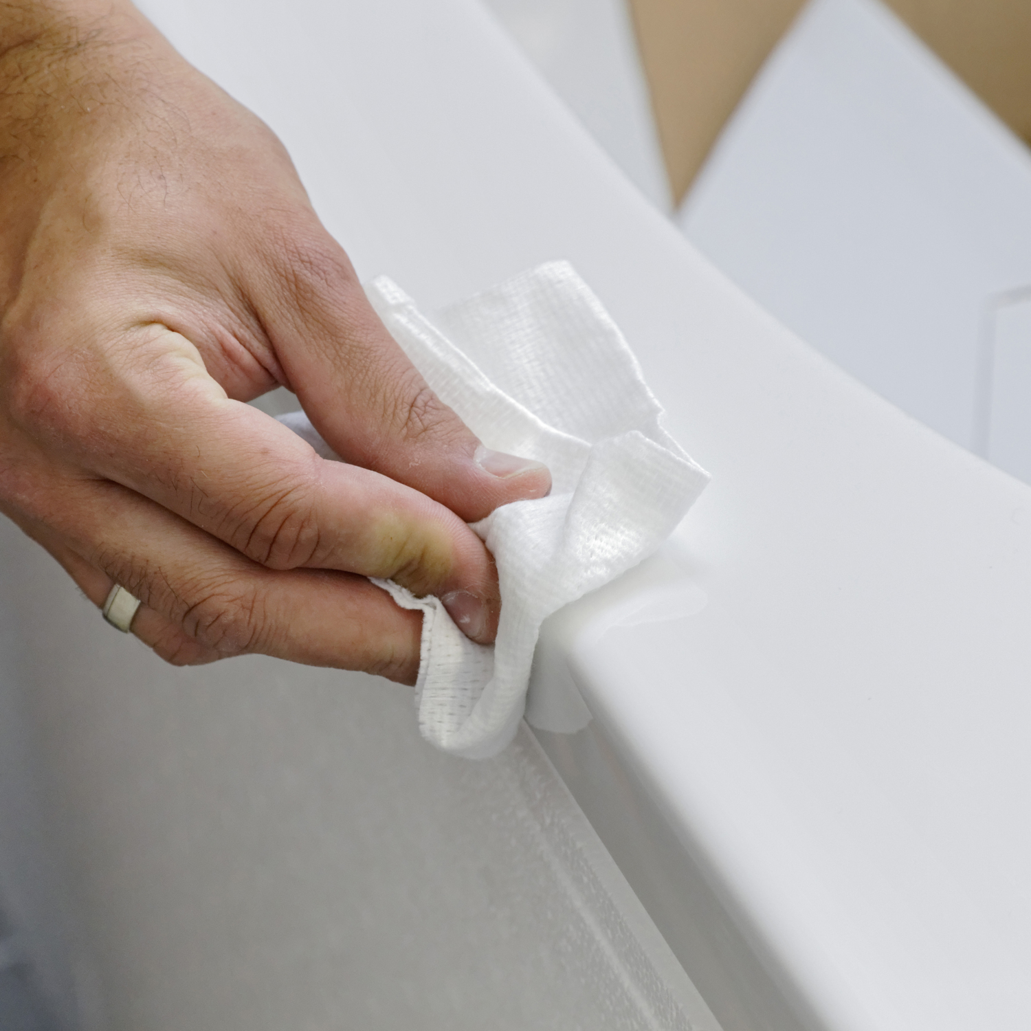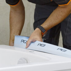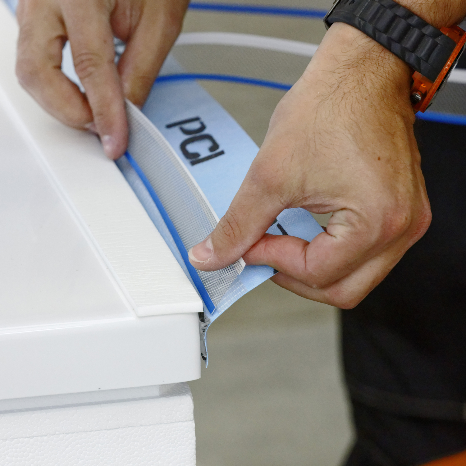 Dabei muss besonders sorgfältig vorgegangen werden indem der Klebebereich des Wannenrandes gründlich gereinigt wird und die teils starken Rundungen der Ecken durch Eckfüllstoffe aus Butylstreifen zu einem rechten Winkel modelliert werden.